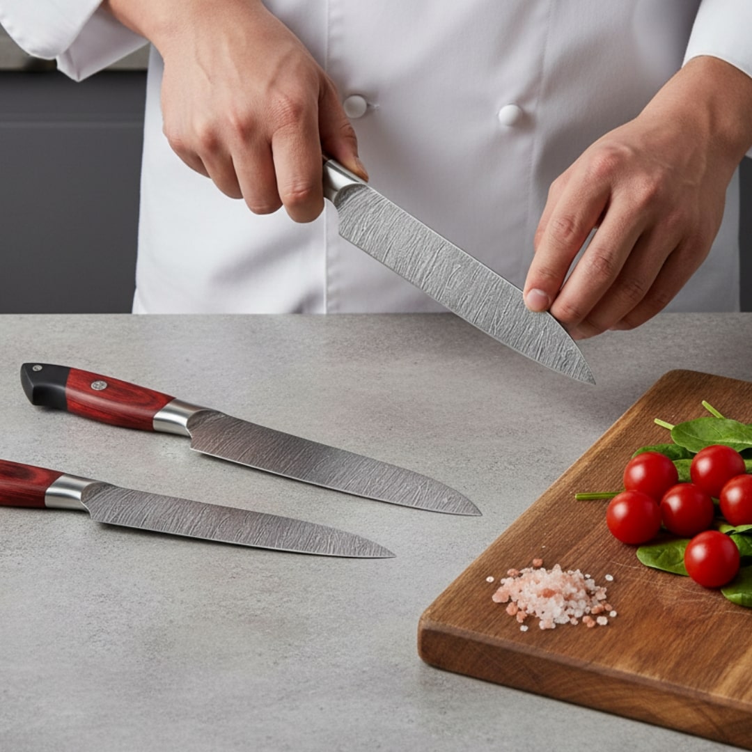 - Premium Handle Design: Red Wood and Black Resin with polished steel bolsters for balance and control.