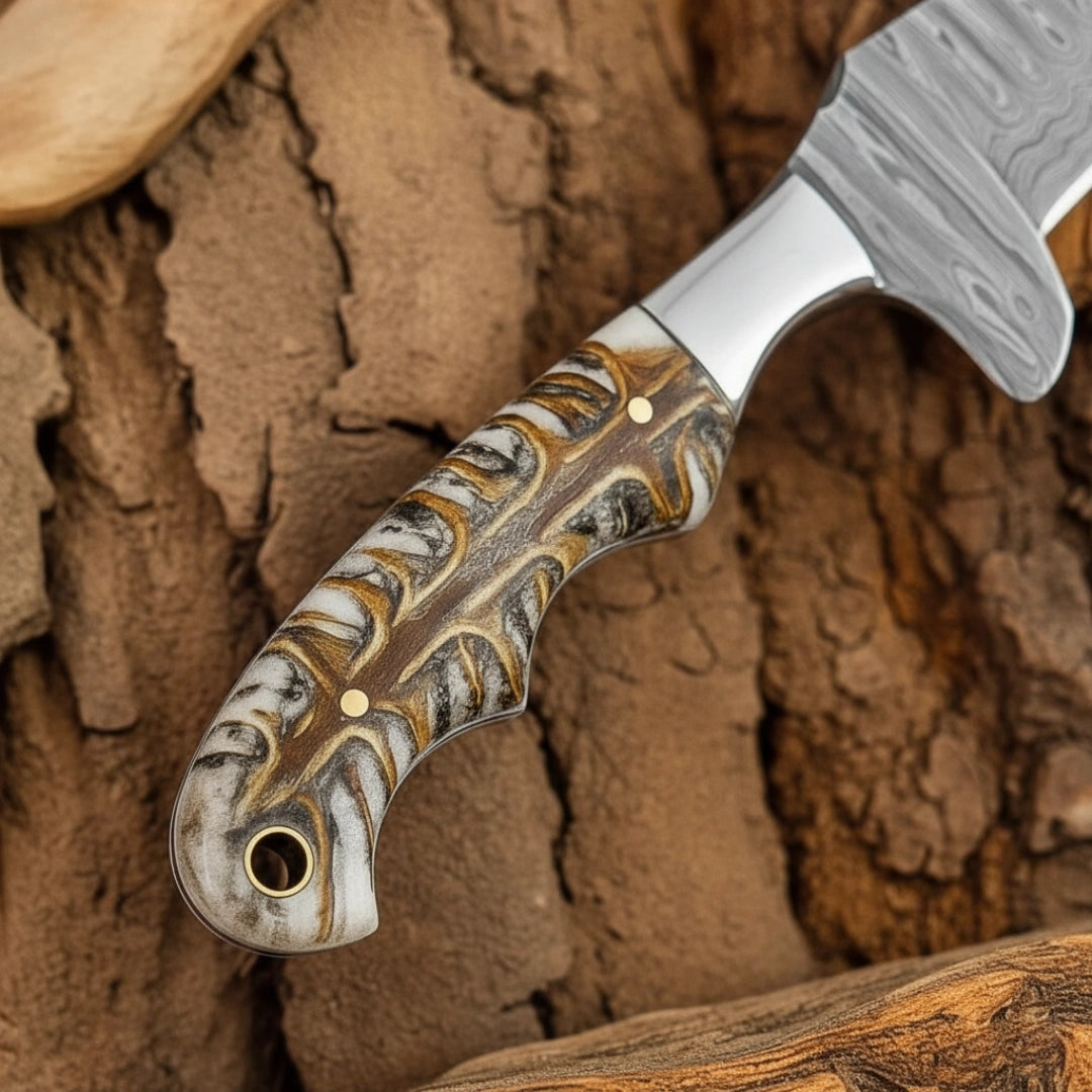 Experience the perfect fusion of strength, craftsmanship, and elegance with the 8" Damascus Bull Cutter Knife with Pinecone Handle. Designed for durability and precision, this handmade knife delivers unmatched performance for outdoor enthusiasts, ranchers, and collectors alike. Its hand-forged Damascus blade and unique pinecone resin handle make it as beautiful as it is functional.