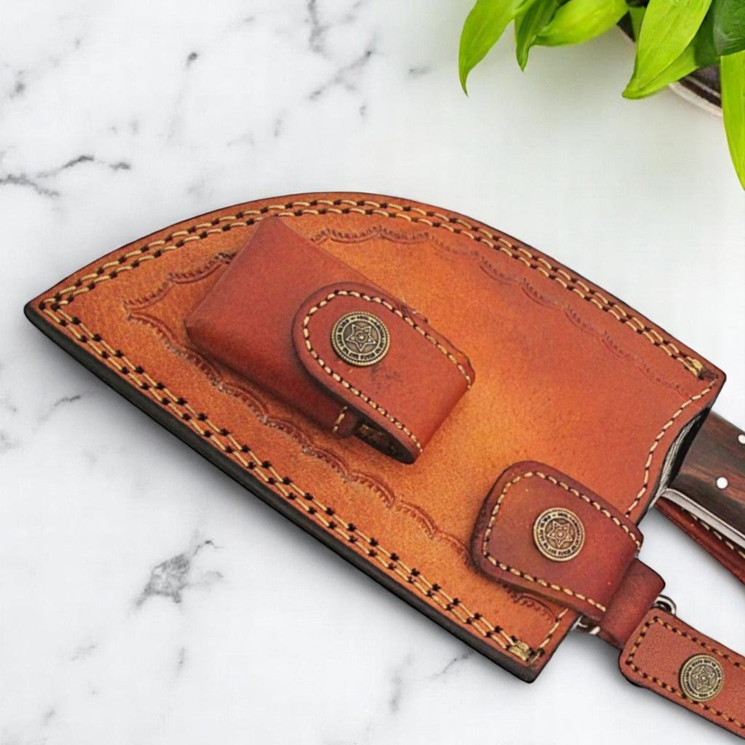 Sheath: Handmade, premium-quality dark brown leather sheath with decorative stitching, attached pouch, and belt loop.