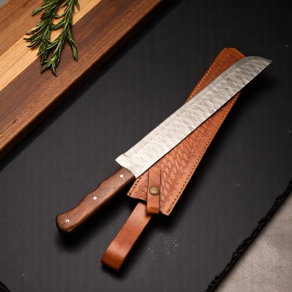 This Damascus blade also features oval indentations ensuring smooth, clean cuts. Paired with a rich, ergonomic Rose Wood handle, this knife offers a comfortable and secure grip, making long slicing tasks a pleasure. A fitted leather sheath is included for safe storage and transport.