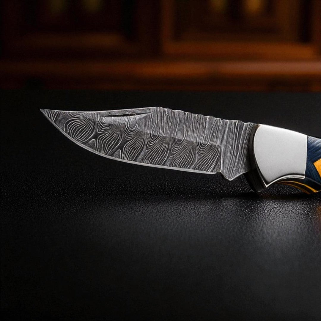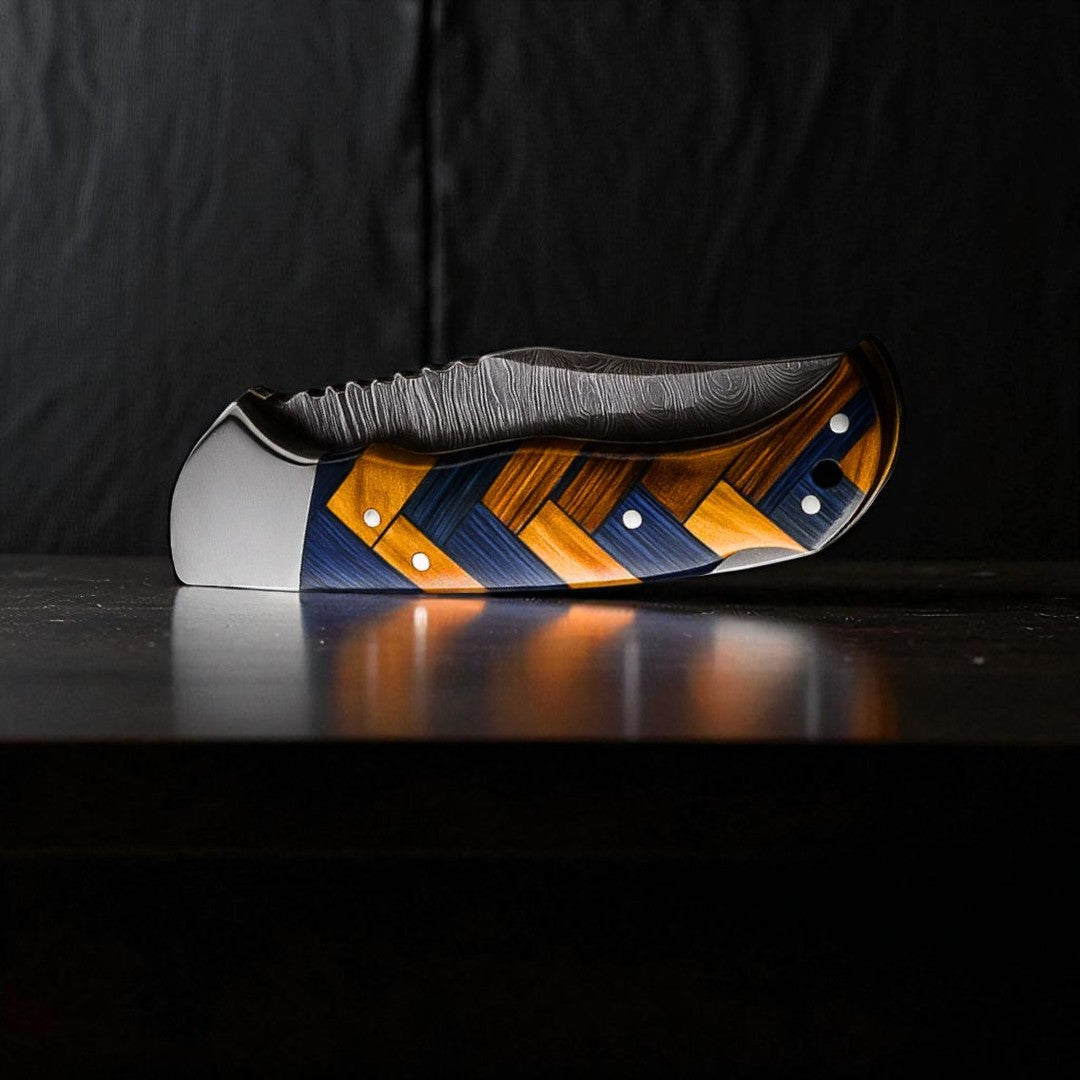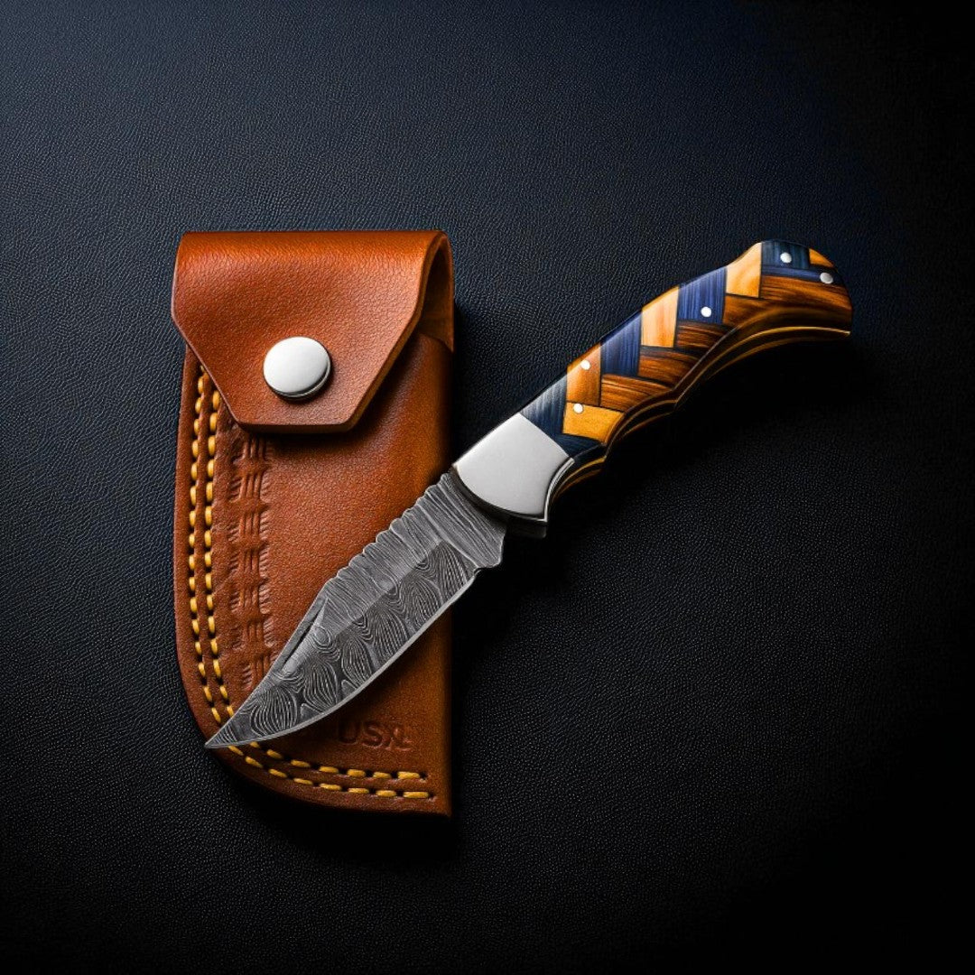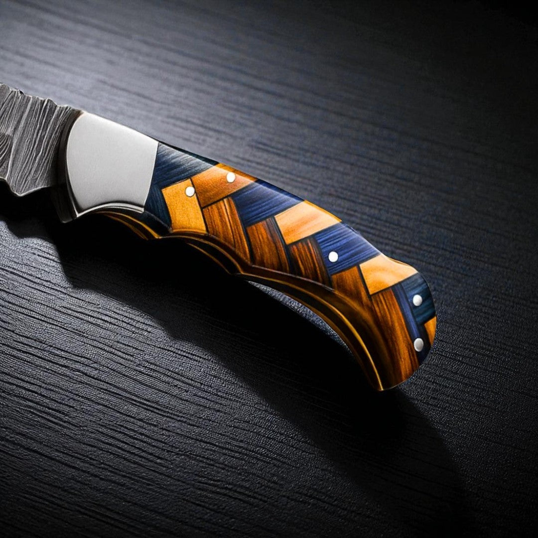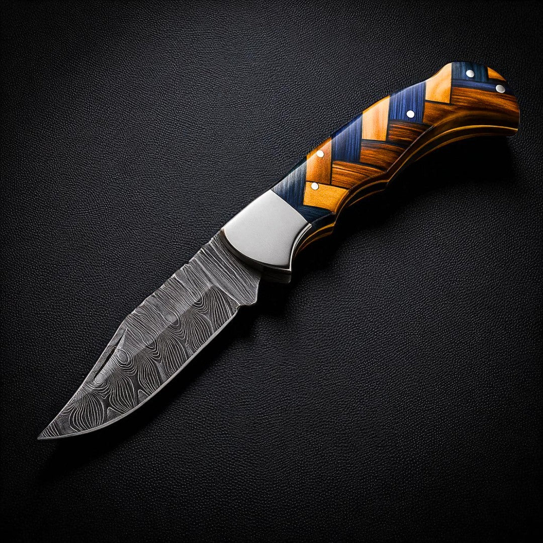 Carry a true statement piece with our Damascus Folding Knife, featuring a vibrant orange and blue chevron wood handle. This unique pocket knife is designed for everyday carry (EDC), outdoor utility, and makes a bold impression with its exquisite craftsmanship. The blade is hand-forged from authentic Damascus Steel, showcasing mesmerizing wavy patterns and a textured spine that are hallmarks of its superior strength and captivating aesthetics. This premium Damascus blade is renowned for its incredible sharpness and lasting edge retention.