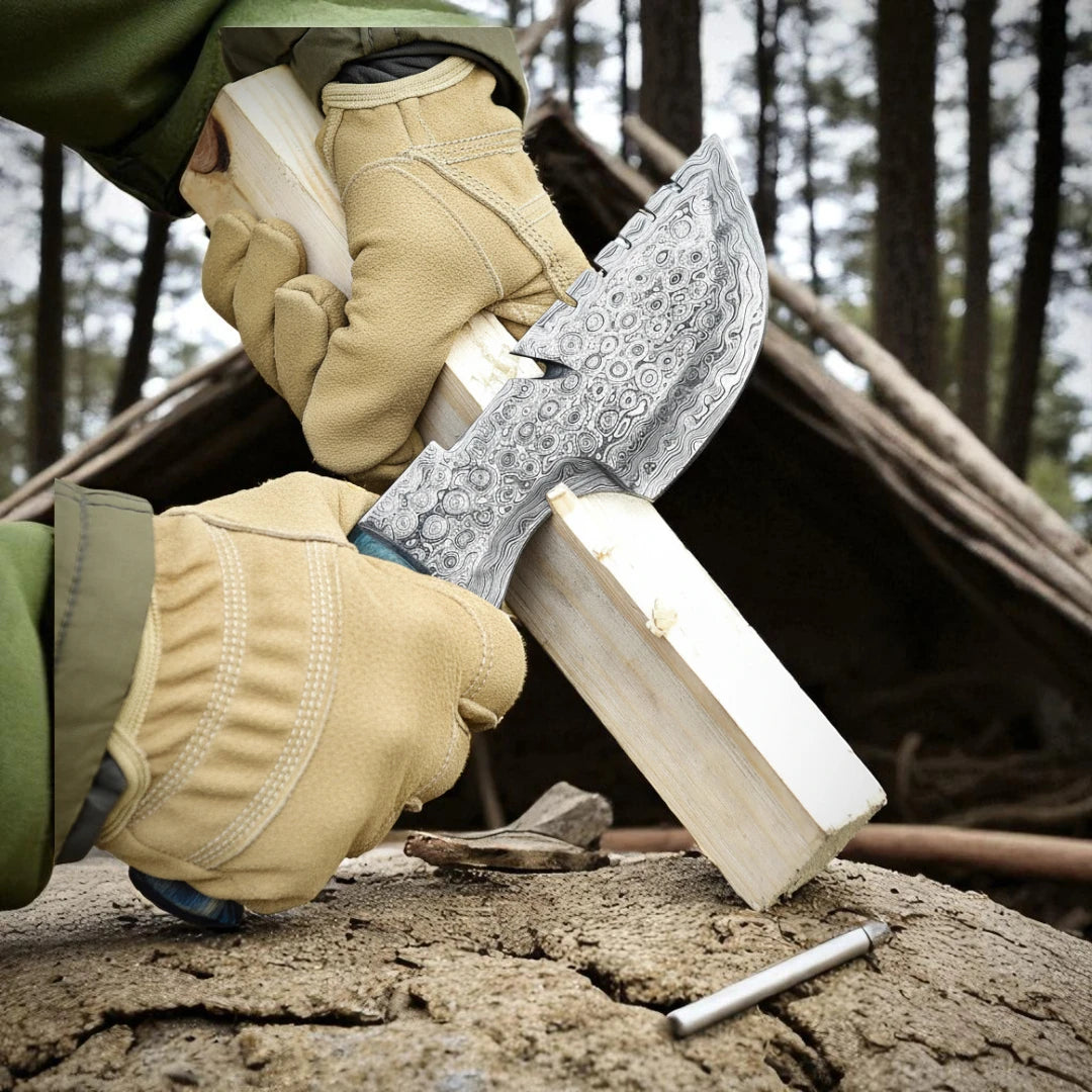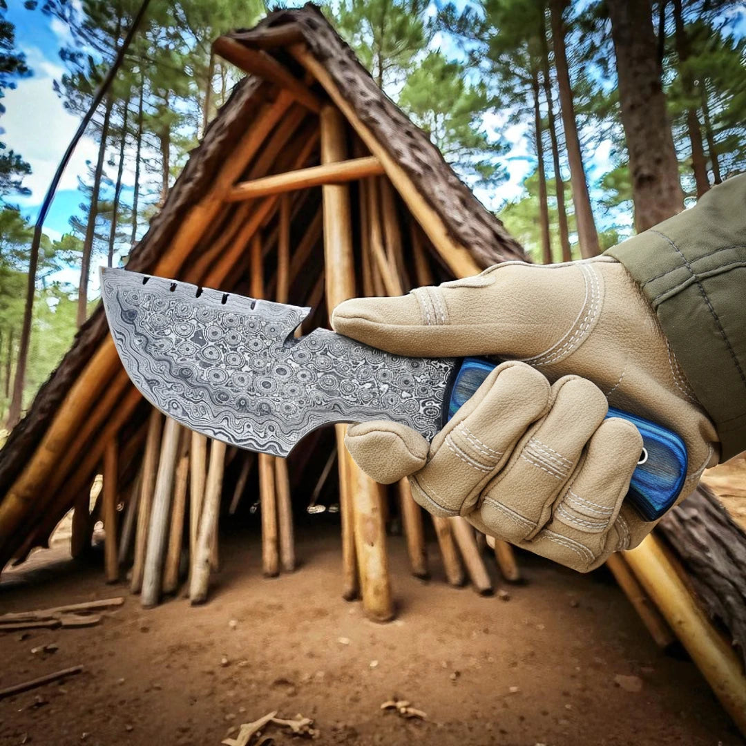 The handle, a polished resin-wood hybrid with bold ocean-blue tones, provides an ergonomic grip enhanced by lanyard holes for secure carry. The Damascus patterns symbolize strength, resilience, and uniqueness making this more than a tool; it’s a statement piece for collectors. Whether you’re chopping wood, crafting shelters, or preparing meals in the wild, this knife delivers unmatched performance.