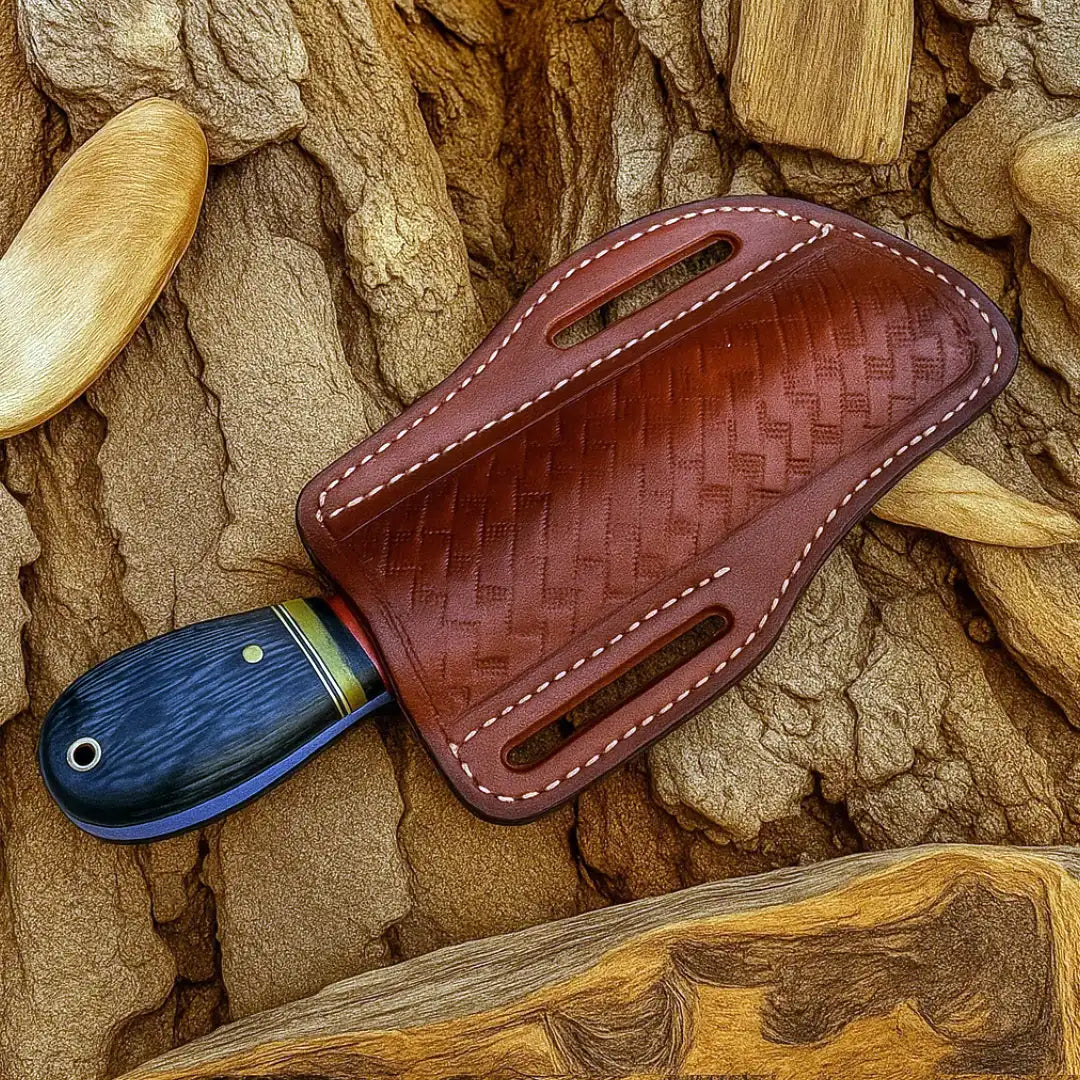 - High-Quality Leather Sheath: Decorative brown leather sheath with belt loops for secure storage and easy access.