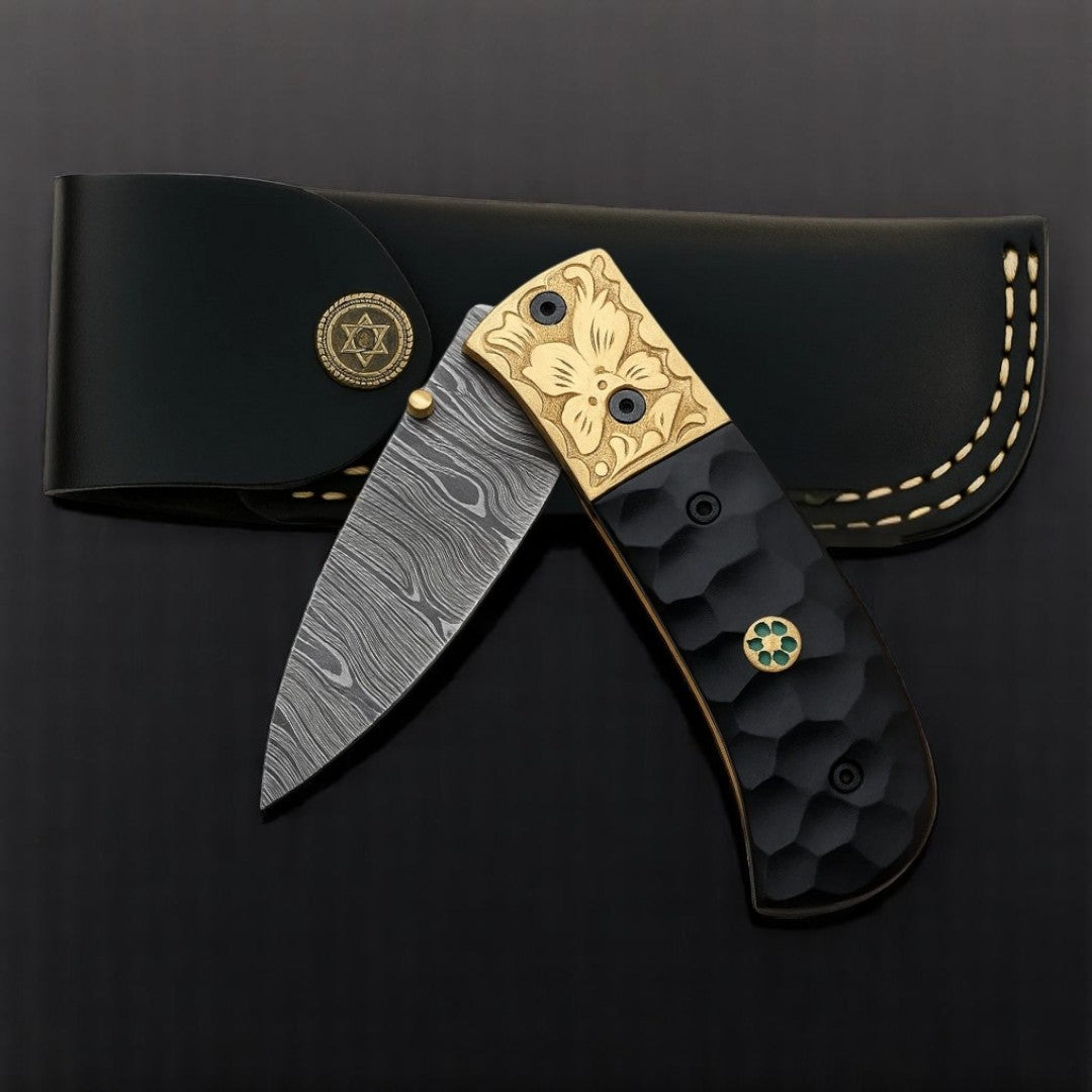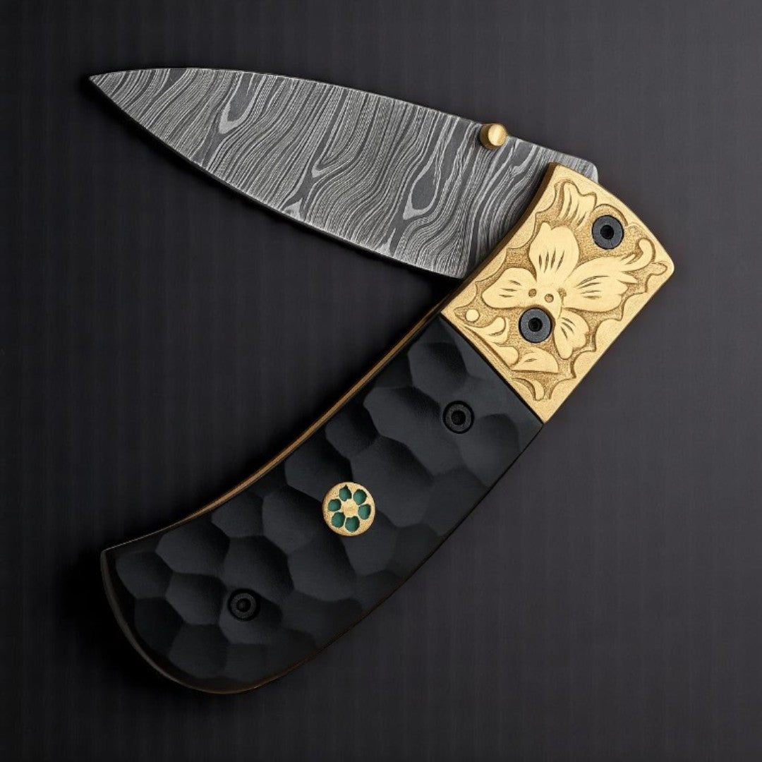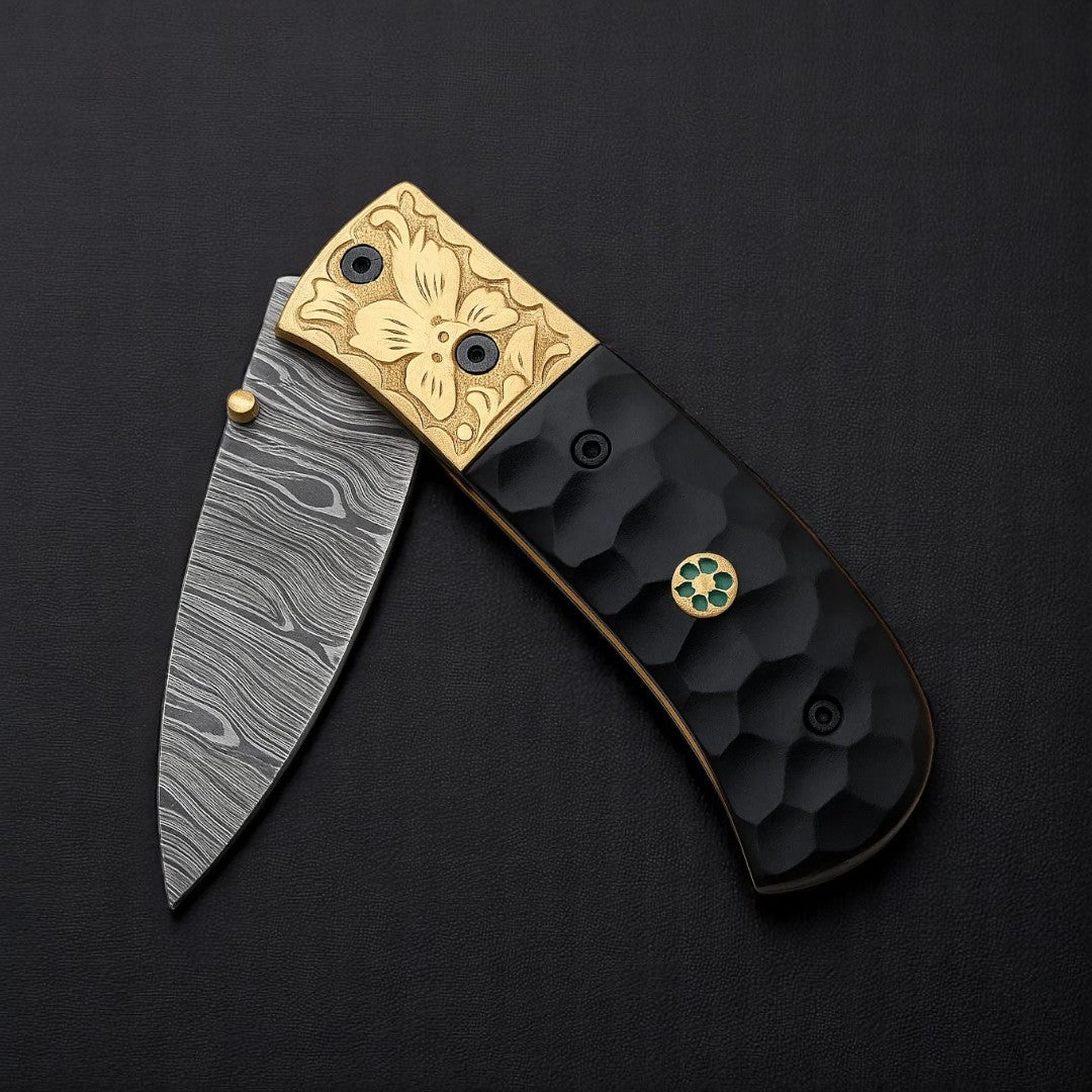 Carry a touch of timeless artistry and reliable utility in your pocket with our Damascus Folding Knife, featuring a captivating black textured handle and an intricately detailed floral brass bolster. This isn't just a knife; it's a statement piece that blends exquisite craftsmanship with everyday functionality. Imagine the admiring glances as you reveal the hand-forged Damascus steel blade, its mesmerizing wavy patterns telling a story of strength and dedication. This isn't just sharp; it's a precision cutting tool designed to hold its razor edge, ready for whatever your day throws your way.