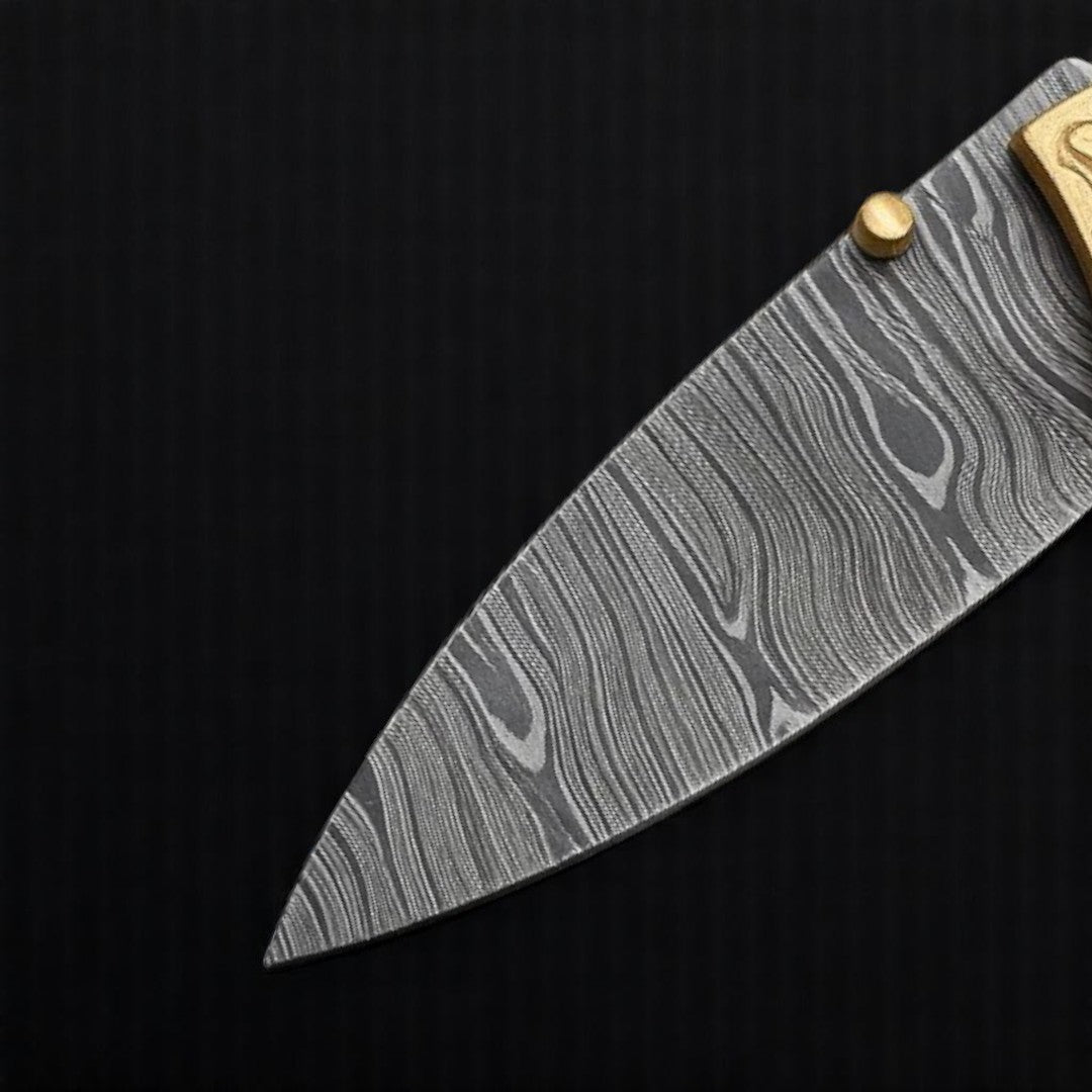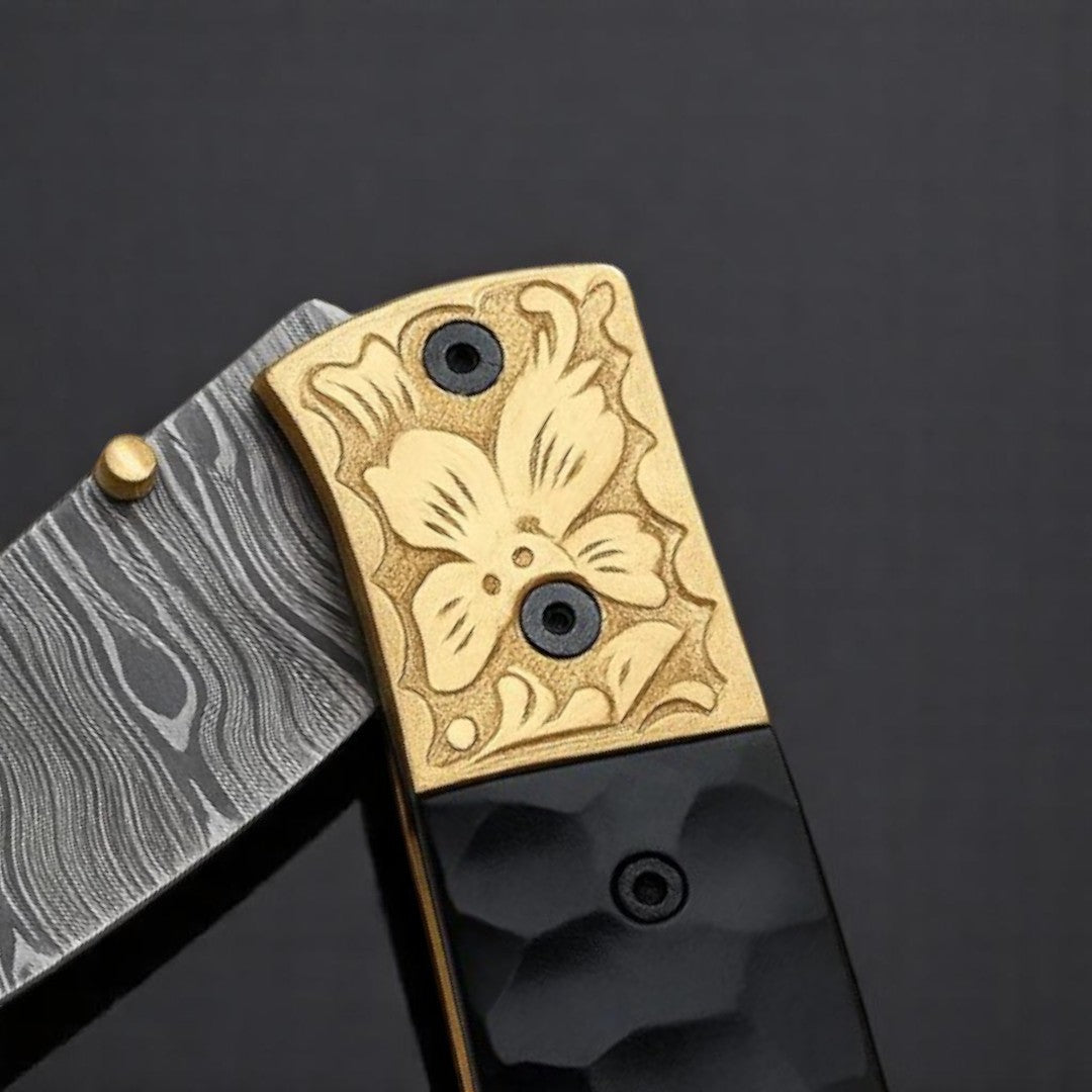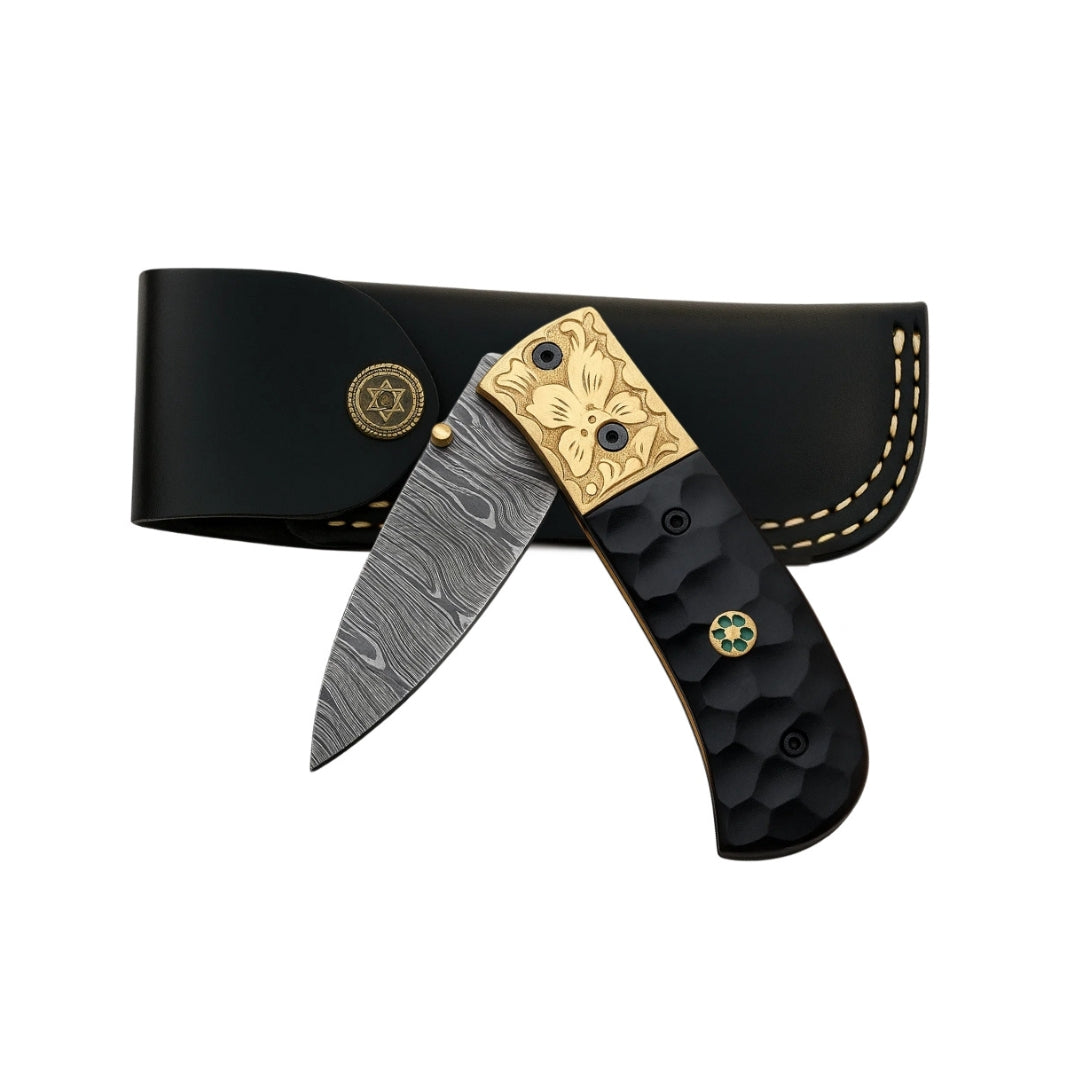 Carry a touch of timeless artistry and reliable utility in your pocket with our Damascus Folding Knife, featuring a captivating black textured handle and an intricately detailed floral brass bolster. This isn't just a knife; it's a statement piece that blends exquisite craftsmanship with everyday functionality. Imagine the admiring glances as you reveal the hand-forged Damascus steel blade, its mesmerizing wavy patterns telling a story of strength and dedication. This isn't just sharp; it's a precision cutting tool designed to hold its razor edge, ready for whatever your day throws your way.