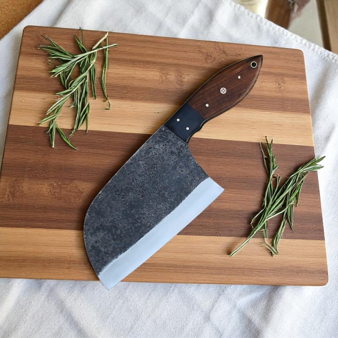 This Bone Splitter Serbian Cleaver Knife stands out for its exceptional handmade quality and formidable performance. With its 5 mm thick blade of hardened 65G steel, it provides reliable cutting and chopping of even bones. The unique "broken stones" texture on the blade adds to its rugged beauty and helps with food release. The comfortable Walnut wood handle offers a natural feel and secure grip, while its design ensures perfect balance for powerful and precise cuts. This cleaver is a durable and unique tool, essential for anyone demanding strength, precision, and artistry in their kitchen cutlery. It comes with a high-quality leather case, ensuring safe storage.