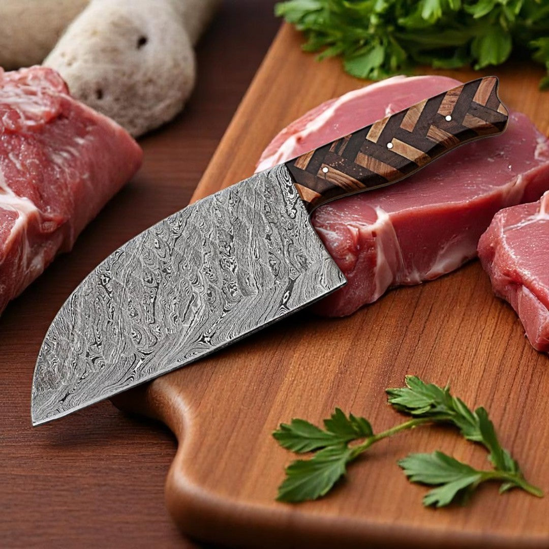 Unleash powerful and versatile cuts in your kitchen with our Damascus Serbian Cleaver Knife. This exceptional tool is renowned for its distinctive design, blending the robust chopping power of a cleaver with the precise slicing ability of a chef's knife, making it ideal for every culinary challenge. The wide blade is hand-forged from authentic Damascus Steel, showcasing an intricate, mesmerizing pattern that is a hallmark of its superior strength and captivating beauty. This premium Damascus blade is known for its incredible sharpness and lasting edge retention, ensuring reliable performance for all your heavy-duty needs.