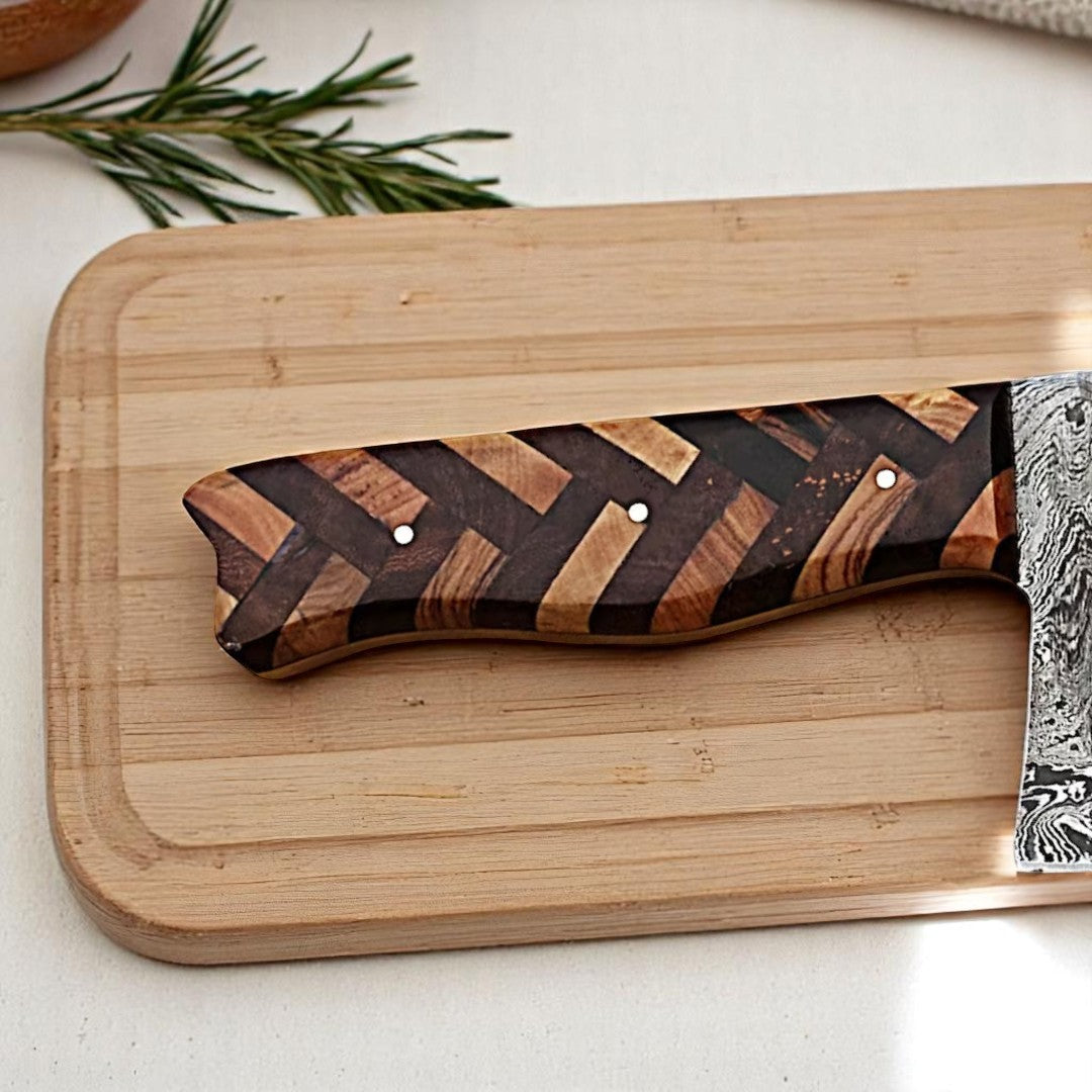 - Handle Material: Unique Wood (contrasting light and dark wood segments) with Rivets