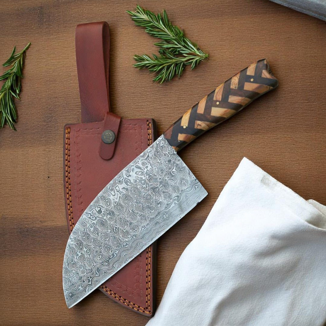 At True Knife Damascus Serbian Cleaver Knife offers a blend of rugged power, stunning artistry, and exceptional versatility. Its hand-forged Damascus steel blade features a beautiful pattern, providing outstanding sharpness and durability for the toughest kitchen tasks.