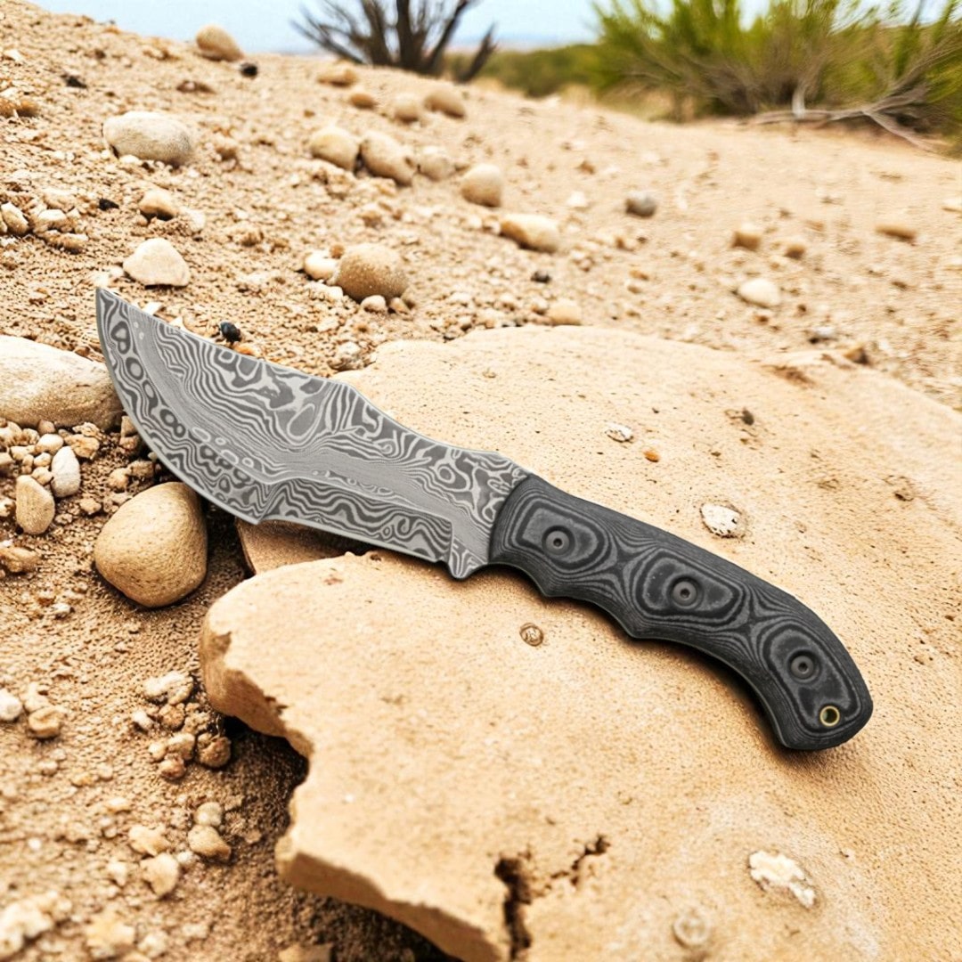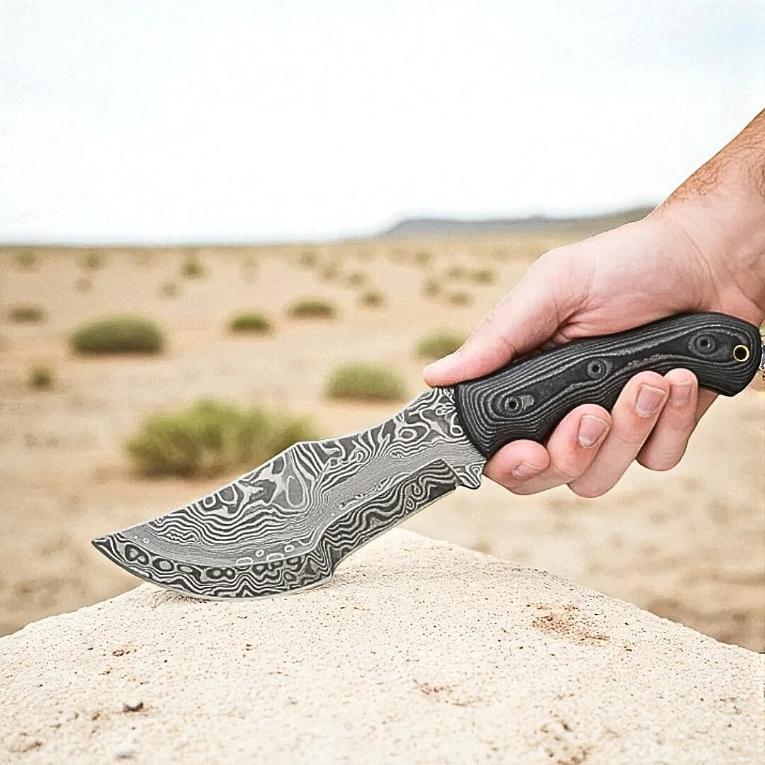 The handle, crafted from high-strength Micarta, provides an ergonomic and slip-resistant grip even in challenging conditions. Designed with a curved tracker blade profile, it excels at chopping, carving, and slicing. Each piece symbolizes strength and precision more than just a tool, it’s a functional work of art. Whether you’re in the field, camping, or collecting, this knife delivers exceptional power and control.