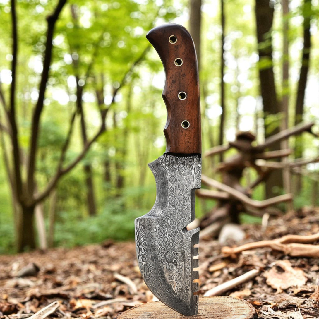 The full-tang construction ensures durability and stability, while the hand-polished rosewood handle featuring a natural grain finish and lanyard hole provides a secure, ergonomic grip in any weather. Its tracker-style profile, complete with thumb notching and a curved peak, enhances precision for tasks such as chopping wood, carving kindling, or skinning game. This isn’t just a knife it’s a functional keepsake with character, reflecting craftsmanship and history in every fold of its Damascus layers.